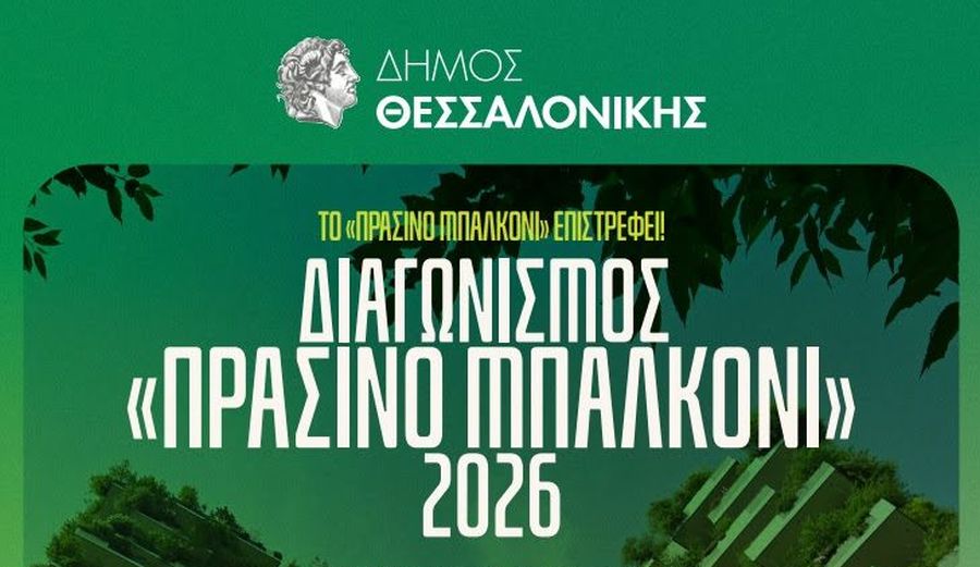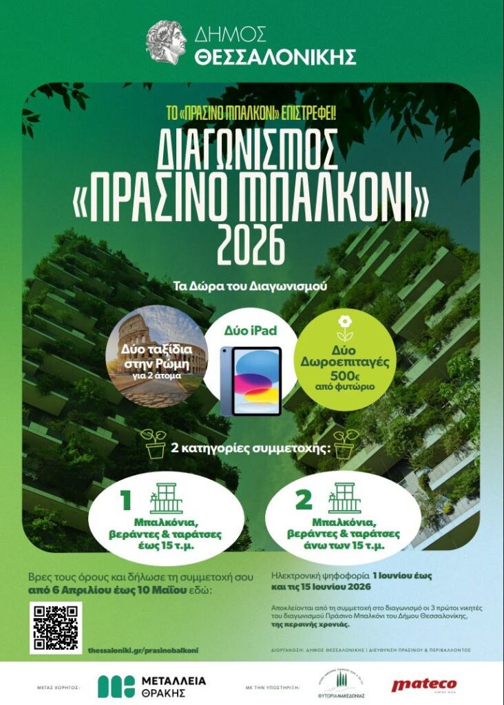 Από την 6η Απριλίου έως και τις 10 Μαΐου 2026, ενήλικες κάτοικοι του Δήμου Θεσσαλονίκης μπορούν να δηλώσουν συμμετοχή ηλεκτρονικά στην ιστοσελίδα http://www.thessaloniki.gr/prasinobalkoni, υποβάλλοντας φωτογραφίες των πράσινων δημιουργιών τους σε μπαλκόνια ή ταράτσες.