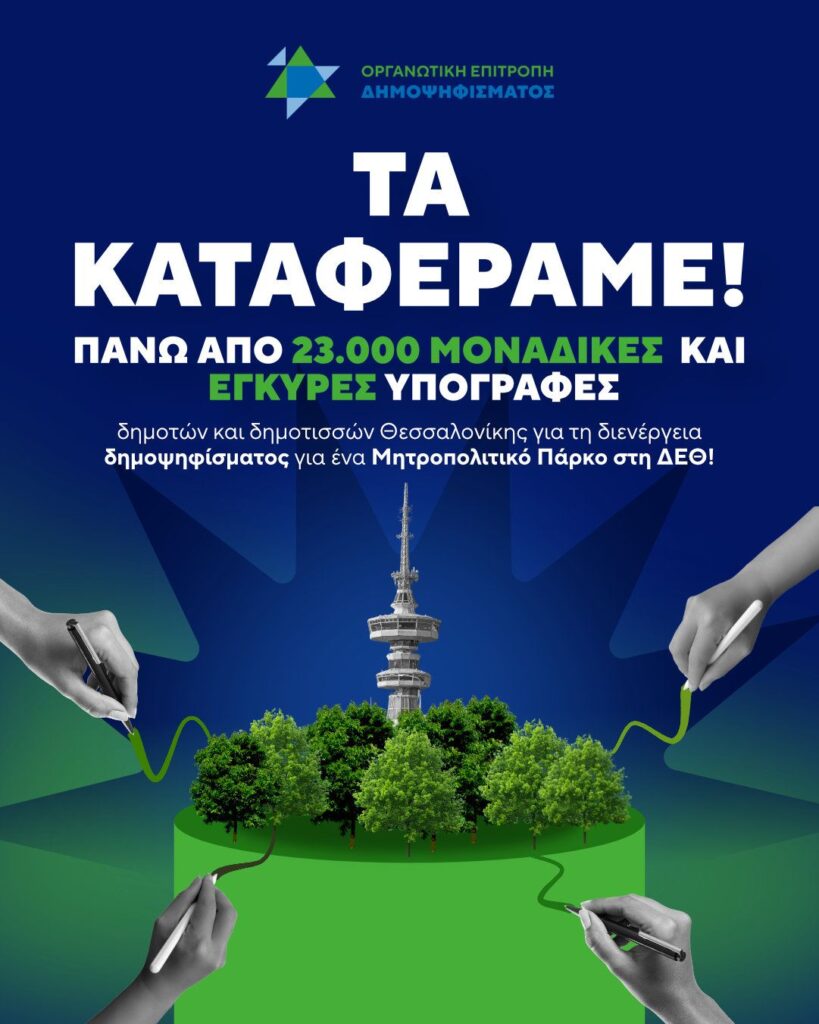 Ξεπέρασαν τις 23.000 υπογραφές για τη διεξαγωγή δημοψηφίσματος για το μέλλον της ΔΕΘ, όπως έκανε γνωστό η Επιτροπή Δημοψηφίσματος. Αυτός ήταν ο μεγάλος στόχος και ο αριθμός που απαιτούνταν για να ανάψει το πράσινο φως για τη διεξαγωγή του πρώτου επίσημου δημοτικού δημοψηφίσματος στην ιστορία της χώρας.