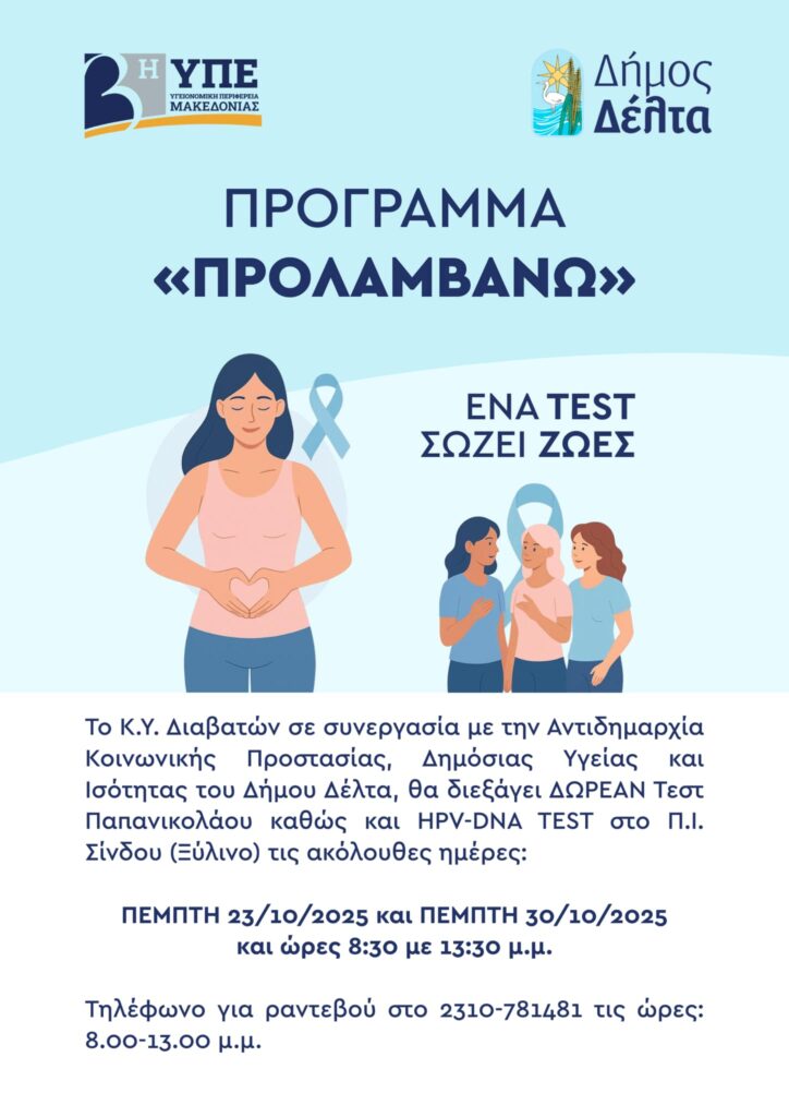 Μέσω του προγράμματος «Προλαμβάνω», ο Δήμος Δέλτα και το Κέντρο Υγείας Διαβατών ενώνουν τις δυνάμεις τους και στηρίζουν έμπρακτα την πρόληψη και τη γυναικεία υγεία.