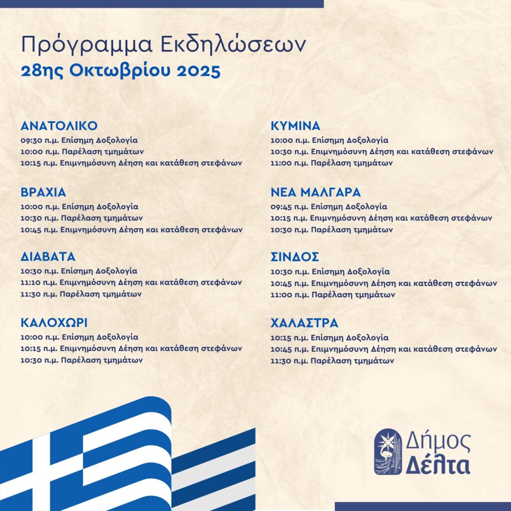 Αναλυτικά το πρόγραμμα εκδηλώσεων της 28ης Οκτωβρίου 2025 στον Δήμο Δέλτα: