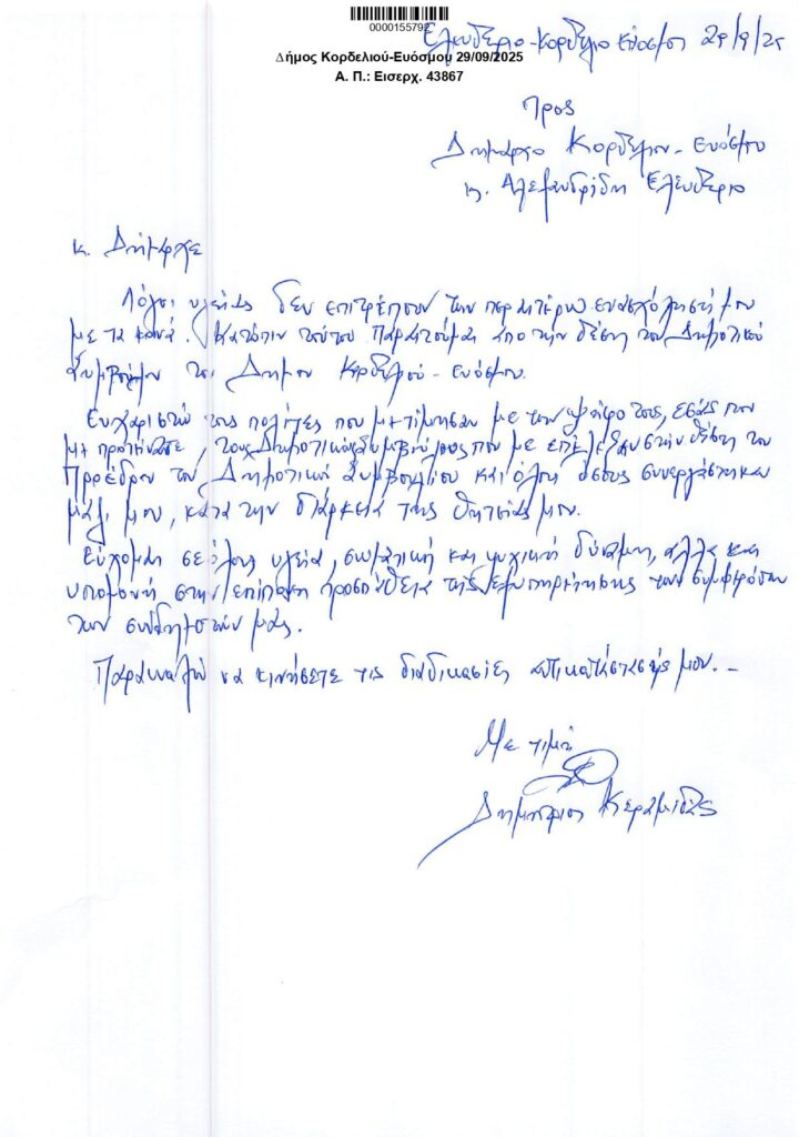 Λόγοι υγείας δεν επιτρέπουν την περαιτέρω ενασχόλησή μου με τα κοινά. Κατόπιν τούτου παραιτούμαι από την θέση του Δημοτικού Συμβούλου του Δήμου Κορδελιού – Ευόσμου.