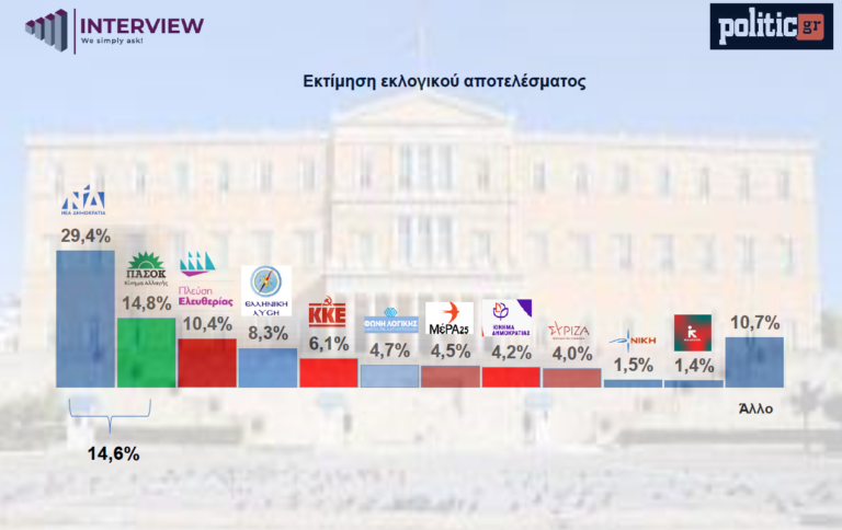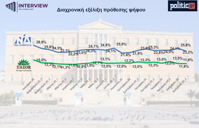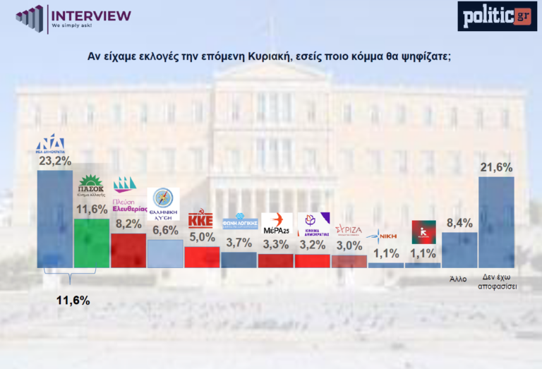Σταθερή παρουσιάζεται η Νέα Δημοκρατία στην τελευταία για τη χρονιά που διασχίζουμε, δημοσκόπηση της Interview για λογαριασμό της POLITIC. Συγκεκριμένα, η Νέα Δημοκρατία διατηρεί την πρωτιά με 23,2%, το ΠΑΣΟΚ παραμένει δεύτερο με 11,6%, ενώ η Πλεύση Ελευθερίας είναι στην τρίτη θέση ενισχύοντας το ποσοστό της στο 8,2%. Το 21,6% των αναποφάσιστων αποτελεί ίσως το πιο ηχηρό πολιτικό μήνυμα της δημοσκόπησης, καθώς δείχνει ότι ένας στους πέντε ψηφοφόρους δεν έχει ακόμη αποφασίσει τι θα ψηφίσει, διατηρώντας ανοιχτό και απρόβλεπτο το εκλογικό αποτέλεσμα.