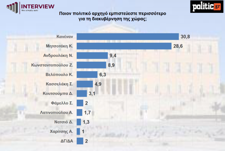 Όσον αφορά την εμπιστοσύνη στη διακυβέρνηση της χώρας, το εύρημα είναι σαφές: Πρώτη επιλογή ο «Κανένας» με 30,8%, ποσοστό που υπερβαίνει κάθε πολιτικό αρχηγό και υπογραμμίζει τη διάχυτη δυσπιστία. Ο Κυριάκος Μητσοτάκης ακολουθεί με 28,6%, ποσοστό που τον κατατάσσει πρώτο μεταξύ των πολιτικών αρχηγών, χωρίς όμως να συγκροτεί πλειοψηφικό μέτωπο εμπιστοσύνης. Οι υπόλοιποι πολιτικοί αρχηγοί κινούνται σε μονοψήφια νούμερα, ενισχύοντας την εικόνα ενός κατακερματισμένου πολιτικού σκηνικού.