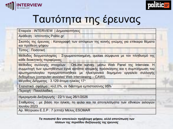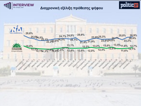 Με 26,9% παραμένει πρώτη η Νέα Δημοκρατία στη δημοσκόπηση της Interview για την POLITIC, ανοίγοντας τη χρονιά με ενίσχυση ποσοστών αλλά χωρίς ανατροπή της γενικής εικόνας. Οι αναποφάσιστοι παραμένουν σε υψηλά επίπεδα (16,7%), ενώ το ΠΑΣΟΚ διατηρεί τη δεύτερη θέση ενισχύοντας το ποσοστό του στο 12,7%.