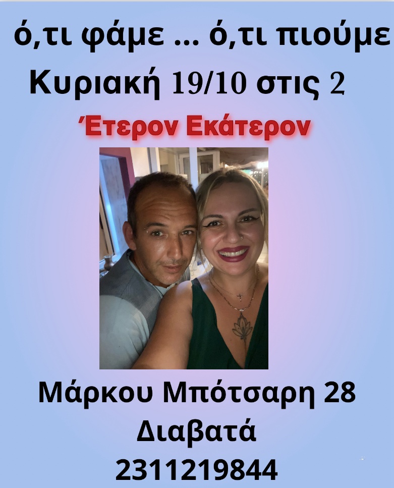 Το μεσημέρι της Κυριακής 19/10, στις 14:00, τη “σκυτάλη” παίρνουν οι Έτερον Εκάτερον, καθώς η Θωμαΐς Ψαρά και ο Βασίλης Καραμανώλης αναμένεται να ξεσηκώσουν τους θαμώνες και να συνοδεύσουν μουσικά τους εκλεκτούς μεζέδες του μαγαζιού.
