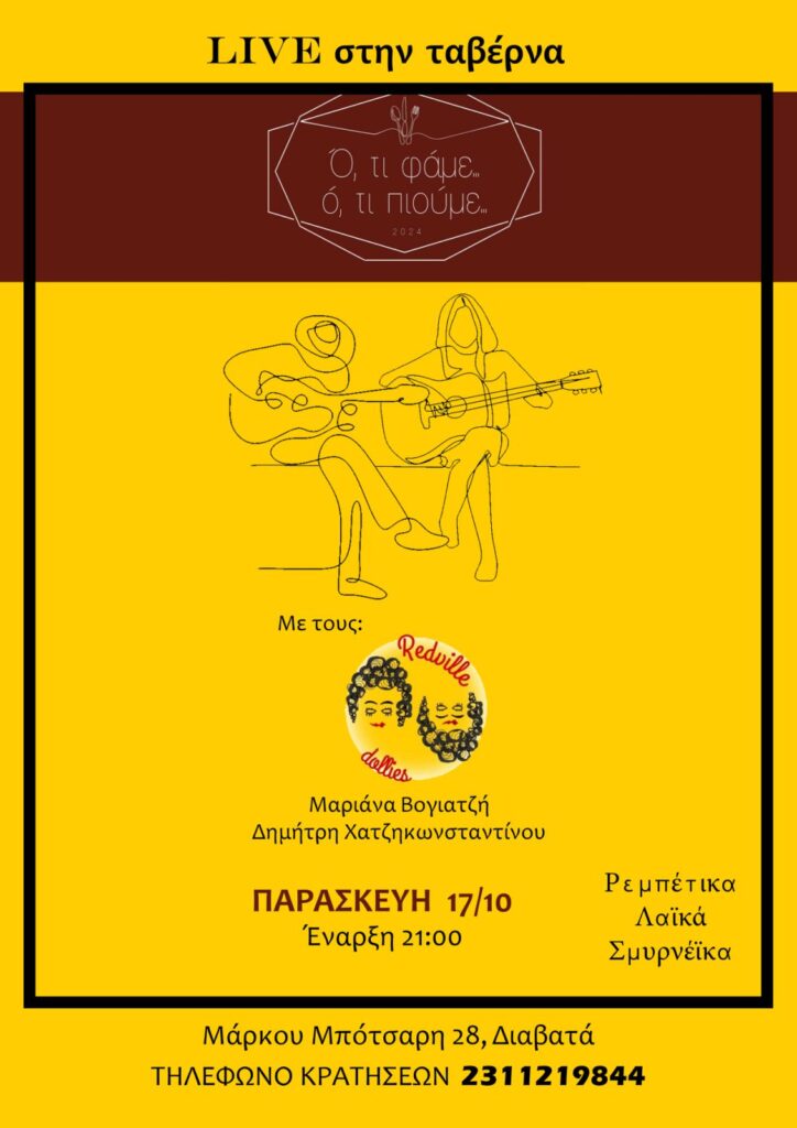 Το βράδυ της Παρασκευής 17/10, στις 21:00, τον… χορό των LIVE ανοίγουν οι Redville Dollies, κατά κόσμον Μαριάνα Βογιατζή και Δημήτρης Χατζηκωνσταντίνου, οι οποίοι υπόσχονται μία μαγευτική βραδιά με λαϊκά, ρεμπέτικα και σμυρνέικα τραγούδια.