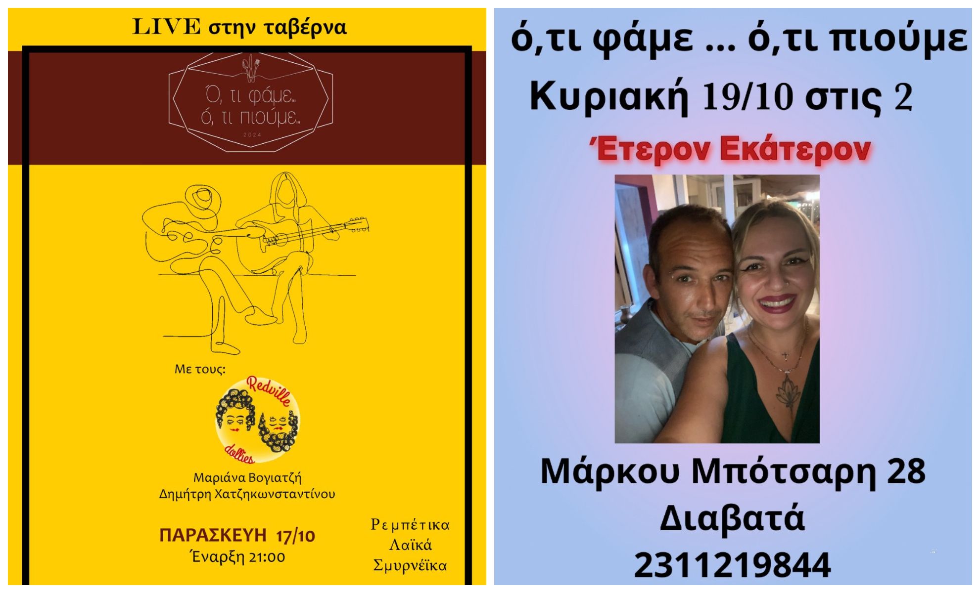 LIVE για… όλα τα γούστα έχει προγραμματίσει για τους θαμώνες του το βραβευμένο μεζεδοπωλείο “Ό,τι Φάμε Ό,τι Πιούμε” (Μάρκου Μπότσαρη 28, Διαβατά) το ερχόμενο ΠΣΚ!