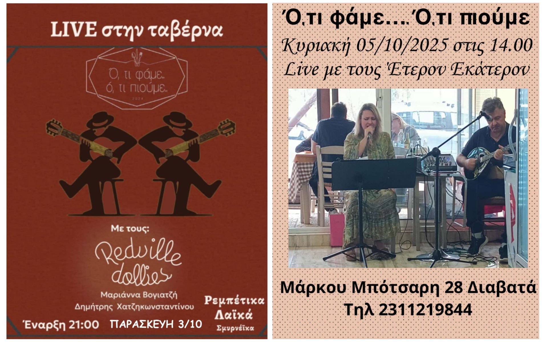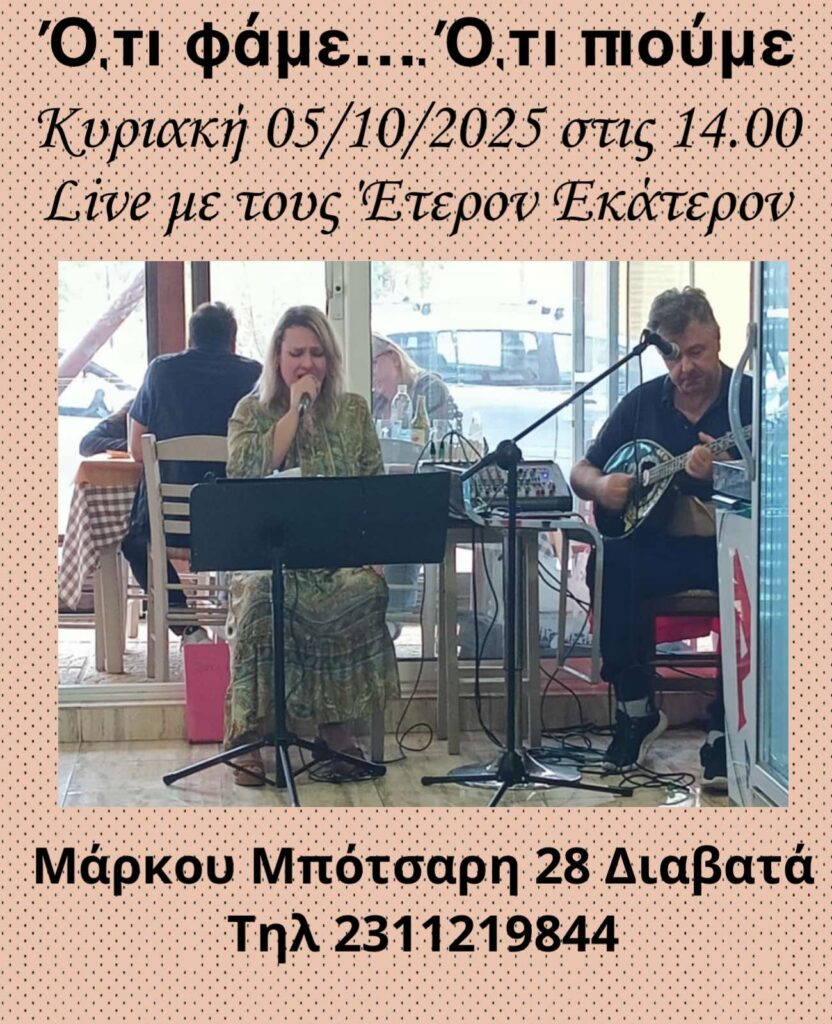 Με διπλό LIVE καλωσορίζει τον Οκτώβριο το βραβευμένο μεζεδοπωλείο “Ό,τι Φάμε Ό,τι Πιούμε” (Μάρκου Μπότσαρη 28, Διαβατά)!