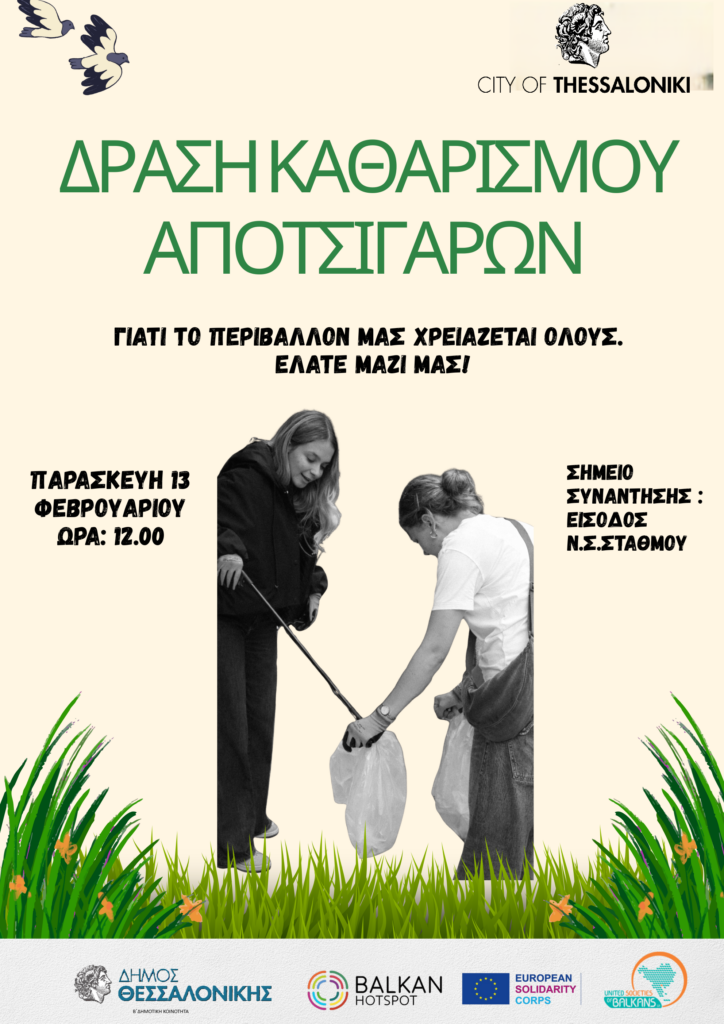 Με ώρα συνάντησης τις 12:00μμ και σημείο εκκίνησης την είσοδο του Νέου Σιδηροδρομικού Σταθμού Θεσσαλονίκης, η δράση στοχεύει στην απομάκρυνση αποτσίγαρων από δρόμους και πεζοδρόμια και είναι ανοιχτή σε όλους τους πολίτες που θέλουν να συμβάλλουν σε μια πιο καθαρή και φιλική πόλη.
