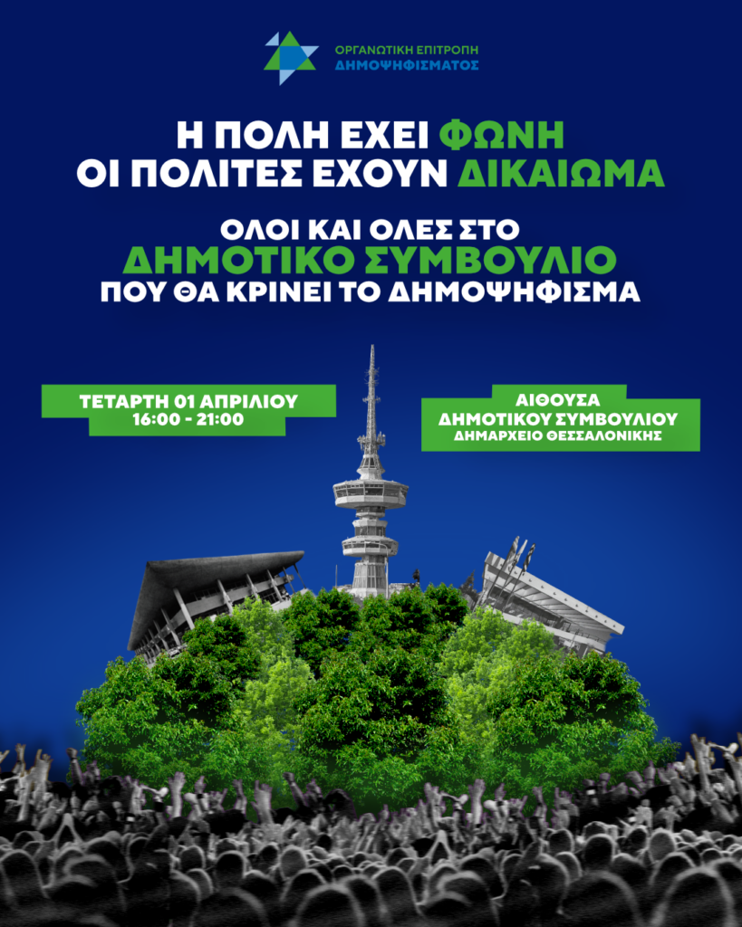 Η Οργανωτική Επιτροπή Δημοψηφίσματος για τη ΔΕΘ και το Μητροπολιτικό πάρκο καλεί τους δημότες και τις δημότισσες Θεσσαλονίκης, καθώς και κάθε πολίτη που στηρίζει το αίτημα για δημοκρατία, δημόσιο χώρο και πράσινο, να δώσουν μαζικά το παρών την Τετάρτη 1 Απριλίου, στις 16:00, στο Δημαρχείο Θεσσαλονίκης, κατά τη συνεδρίαση του Δημοτικού Συμβουλίου, όπου θα συζητηθεί το αίτημα για τη διενέργεια τοπικού δημοψηφίσματος.