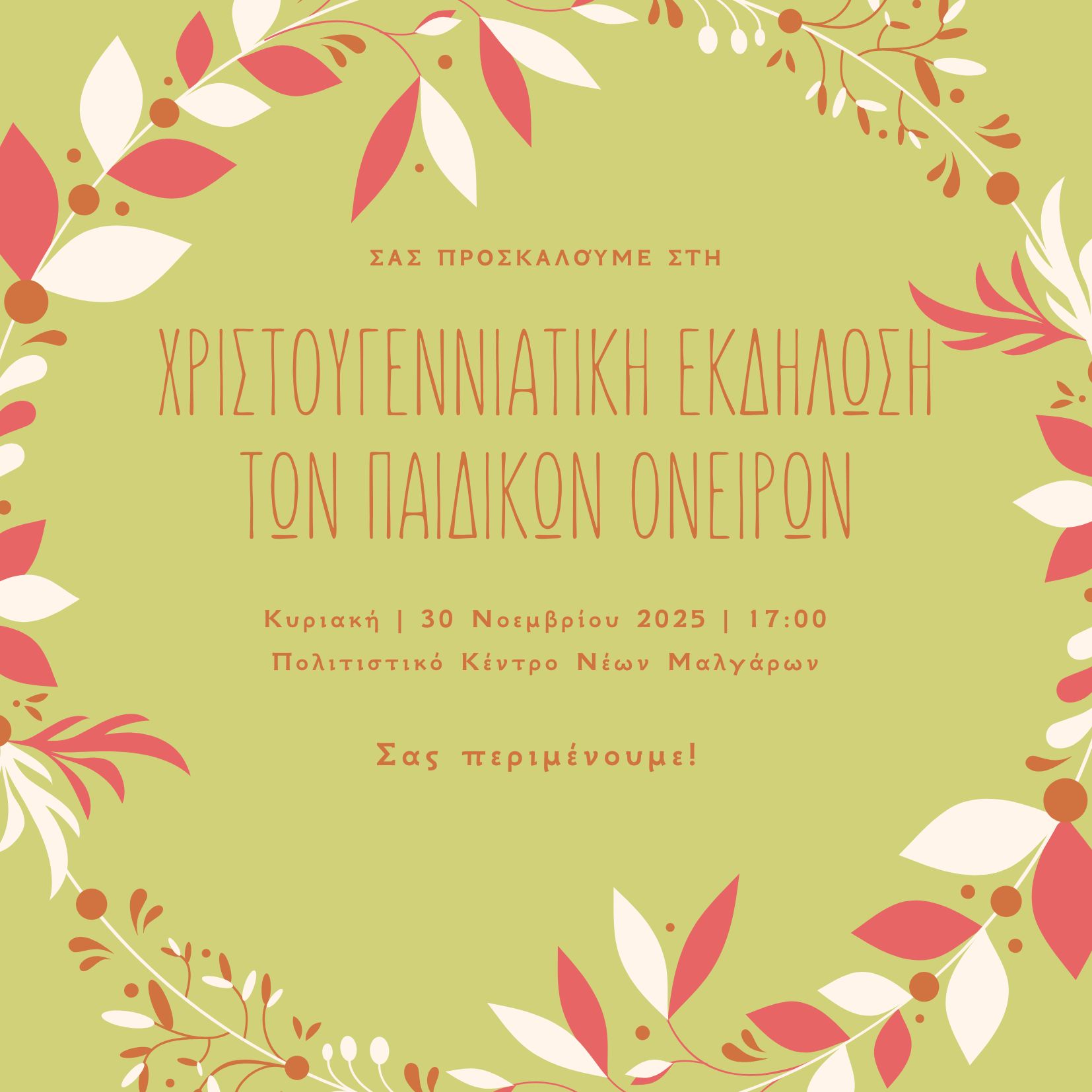 Την Κυριακή 30/11, στις 17:00, θα πραγματοποιηθεί η χριστουγεννιάτικη εκδήλωση του Συλλόγου Γονέων και Φίλων Παιδιών με Ειδικές Ανάγκες “Παιδικά Όνειρα”. Η γιορτή θα πραγματοποιηθεί στο Πνευματικό Κέντρο Νέων Μαλγάρων και τα μέλη του συλλόγου έχουν ετοιμάσει πολλές και ωραίες εκπλήξεις για όσες και όσους θα ανταποκριθούν στο κάλεσμά τους.