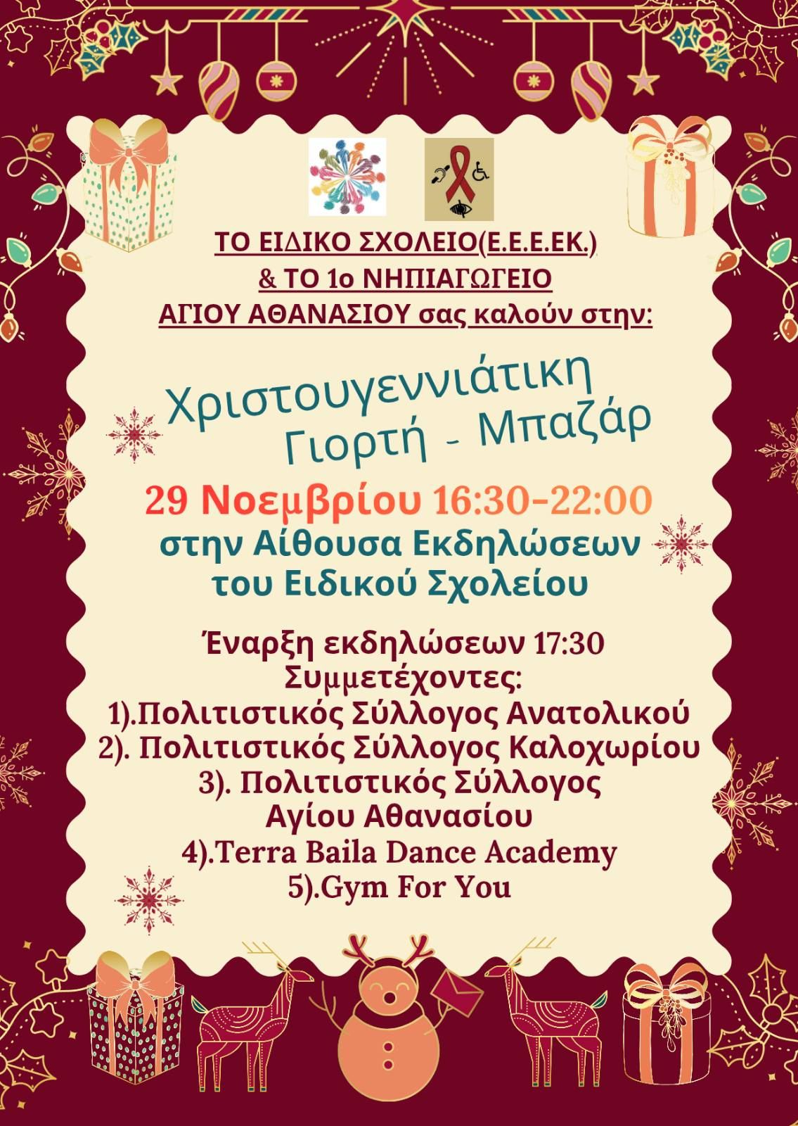 «Ο Σύλλογος Γονέων Κηδεμόνων και Φίλων Ε.Ε.Ε.Ε.Κ. Αγιου Αθανασιου και το 1ο νηπιαγωγείο Αγιου Αθανασίου σας προσκαλούν στη Χριστουγεννιάτικη γιορτή – μπαζαρ, το Σαββατο 29 Νοεμβριου 2025 στον χώρο του ειδικού σχολείου Αγιου Αθανασίου
