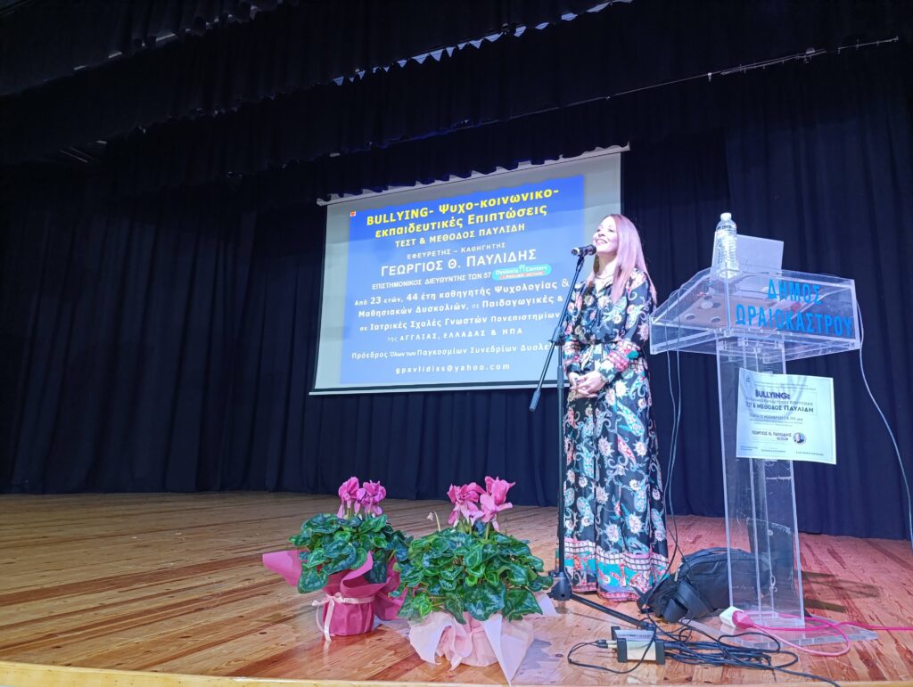 Ο εφευρέτης – καθηγητής, Γιώργος Παυλίδης, μίλησε στη συνέχεια αναλυτικά για τον σχολικό εκφοβισμό. Παρουσίασε στοιχεία που φανερώνουν πως το πρόβλημα μπορεί να παρουσιαστεί ήδη στα πρώτα βήματα του ατόμου στο σχολικό περιβάλλον και κατέθεσε επιστημονικές και εμπειρικές προτάσεις για την αντιμετώπισή του. Επίσης, αναφέρθηκε εκτενώς στις ψυχο-κοινωνικο-εκπαιδευτικές επιπτώσεις του bullying, στο τεστ και την μέθοδο Παυλίδη, που έχει αναπτύξει ο ίδιος για να καταπολεμηθεί. Ακολούθησε συζήτηση και ο καθηγητής, Γιώργος Παυλίδης, απάντησε σε ερωτήσεις του κοινού.